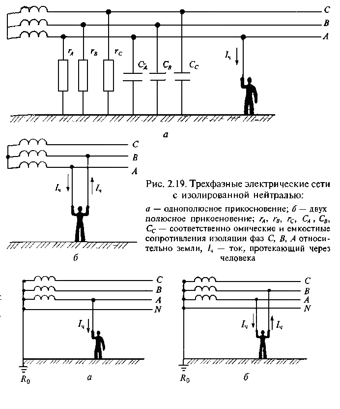 а – однополюсное прикосновение; б – двухполюсное прикосновение; С, В, А, N – фазы; I>ч> – ток, протекающий через человека; R>0> - сопротивление заземлителя в нейтральной точке трансформатора на подстанции.