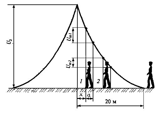 Поражение человека электрическим током может произойти также вследствие его попадания под шаговое напряжение. В этом случае ток протекает в теле человека по пути «нога - нога». Напряжением шага называется разность потенциалов между двумя точками земли, на которые одновременно опирается человек при перемещении в поле растекания тока в земле.