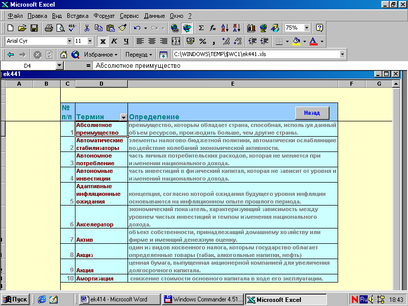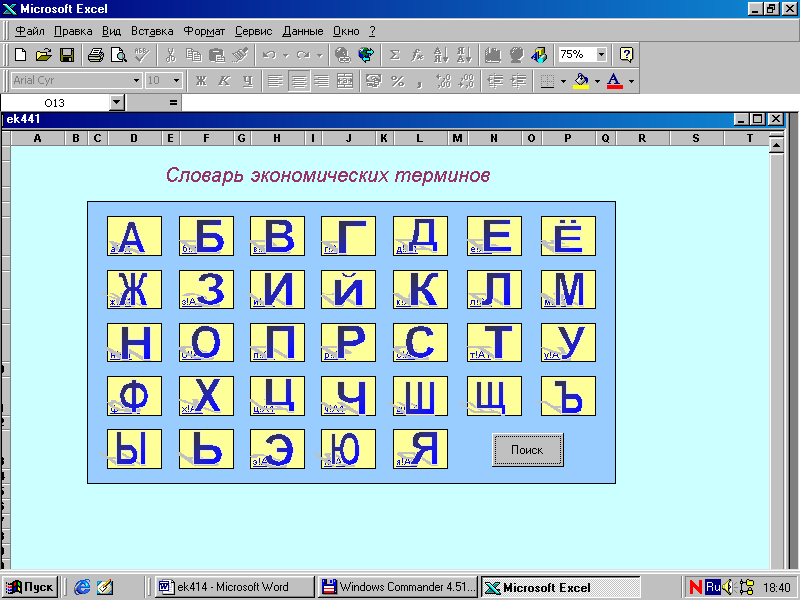 Цель курсового проекта: показать эффективность использования гипертекста в экономике на примере словаря экономических терминов, изучить возможности Excel, ознакомиться с языком программирования Visual Basic.
