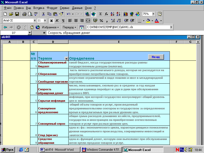 В данном курсовом проекте мы показали эффективность использования гипертекста в экономике на примере словаря экономических терминов, созданного с помощью возможностей табличного процессора Excel и языка программирования Visual Basic.