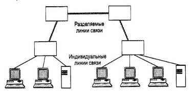 При використанні індивідуальних ліній зв'язку в повнозв'язних топологиях кінцеві вузли повинні мати по одному порту на кожну лінію зв'язку. У зіркоподібних топологиях кінцеві вузли можуть підключатися індивідуальними лініями зв'язку до спеціального пристрою - комутатора. У глобальних мережах комутатори використовувалися вже на початковому етапі, а в локальних мережах - з початку 90-х років. Комутатори приводять до істотного дорожчання локальної мережі, тому поки їх застосування обмежене, але у міру зниження вартості комутації цей підхід, можливо, витіснить застосування ліній зв'язку, що розділяються. Необхідно підкреслити, що індивідуальними в таких мережах є тільки лінії зв'язку між кінцевими вузлами і комутаторами мережі, а зв'язки між комутаторами залишаються такими, що розділяються, оскільки по ним передаються повідомлення різних кінцевих вузлів (рис. 1.4).