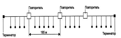 Просте з комунікаційних пристроїв - повторитель (repeater) - використовується для фізичного з'єднання різних сегментів кабелю локальної мережі з метою збільшення загальної довжини мережі. Повторітель передає сигнали, що приходять з одного сегменту мережі, в інших її сегменти (рис. 1.5). Повторітель дозволяє подолати обмеження на довжину ліній зв'язку за рахунок поліпшення якості передаваного сигналу - відновлення його потужності і амплітуди, поліпшення фронтів і тому подібне
