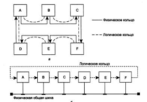 У мережах з кільцевою конфігурацією (рис. 1.2, е) дані передаються по кільцю від одного комп'ютера до іншого, як правило, в одному напрямі. Якщо комп'ютер розпізнає дані як «свої», то він копіює їх собі у внутрішній буфер. У мережі з кільцевою топологією необхідно приймати спеціальні заходи, щоб у разі виходу з ладу або відключення якої-небудь станції не урвався канал зв'язку між рештою станцій. Кільце є дуже зручною конфігурацією для організації зворотного зв'язку - дані, зробивши повний оборот, повертаються до вузла-джерела. Тому цей вузол може контролювати процес доставки даних адресатові. Часто це властивість кільця використовується для тестування зв'язності мережі і пошуку вузла, що працює некоректно. Для цього в мережу посилаються спеціальні тестові повідомлення.