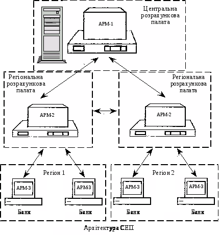СЕП організована як деревоподібна ієрархічна структура (рис. 1). На верхньому рівні СЕП знаходиться центральна розрахункова палата, що обслуговується програмно-технічним комплексом АРМ-1, який виконує захист системи від несанкціонованого доступу, перевірку узгодженості та вірності функціонування РРП, а також формування звітної інформації в масштабах України в цілому.