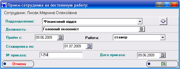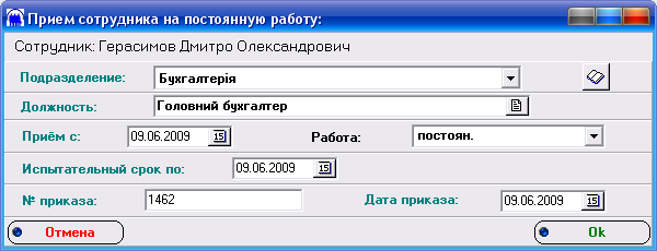 Ввести у вікні необхідні дані: підрозділ, посада, № наказу, дата наказу, з якого числа прийом і період випробувального терміну.