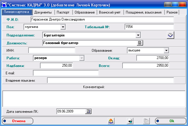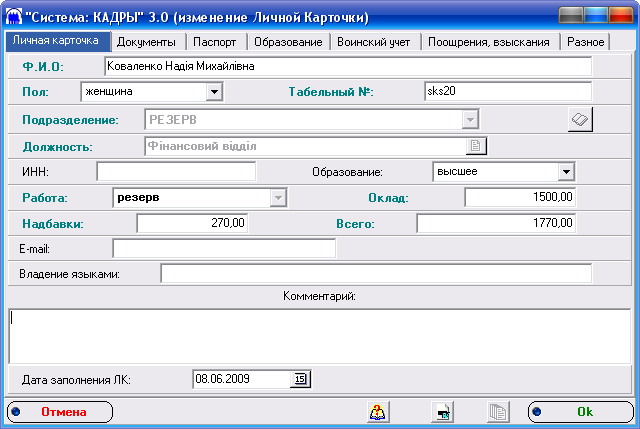 бажані (паспортні дані, освіта, військовий облік, заохочення, стягнення, сумісниця і стаж роботи, пільги, при необхідності - інвалідність) відповідно на вкладках "Паспорт", "Образование", "Воинский учет", "Поощрения, взыскания", "Разное".