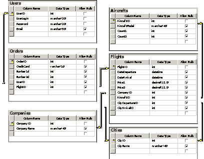Отдельно хранится информация о самолетах с указанием модели самолета, количества свободных мест первого и второго класса, а также о компаниях, которым принадлежат данные самолеты.