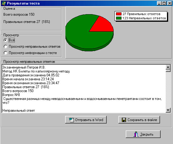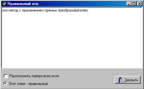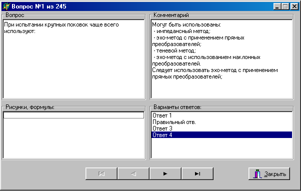 В рамках данной работы был создан пакет программ тестирования и обучения специалистов по неразрушающему контролю. В программном продукте реализована простая, и вместе с тем универсальная, схема построения теста и вычисления оценок. Благодаря этому, достигается достаточная надёжность функционирования программы. Из-за простой реализации алгоритма программа легко отлаживается и тестируется, что снижает вероятность обнаружения ошибок в алгоритме. За счёт универсальности модели теста и наличии отдельной программы-редактора данный пакет программ можно применять для тестирования и обучения по другим тематикам. Отдельное внимание в работе уделено также и вопросам защиты информации. Разработка системы защиты не являлась целью работы, однако программы оснащены базовыми средствами защиты – парольной защитой на вход в программу и защита данных от просмотра.