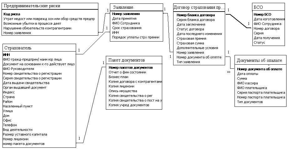 Осуществлено проектирование структуры базы данных для хранения информации о договорах страхования предпринимательских рисков, бланках строгой отчетности, документах об оплате, страхователе, предпринимательских рисков.