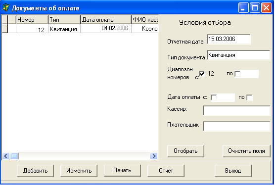 Например, на рис. 28 в условиях отбора указано в качестве "Отчетной даты" – 15.03.06 г., выбран тип документа - квитанция и выбран номер документа об оплате- 12. Это означает, что после нажатия кнопки "Отобрать" в список будет выбран документ об оплате с заданным номером, зарегистрированные в системе до 15.03.06г.