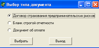 Из основного меню программы (рис.6) можно вызывать режим работы по поиску соответствующего документа: договора страхования предпринимательского риска, или бланка строгой отчетности, или документа об оплате. При нажатии кнопки "Поиск" из главного меню инициируется открытие окна "Выбор документа" (рис.31).