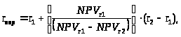 где r>1> – исходная ставка дисконтирования; r>2> – ставка дисконтирования, при которой NPV < 0; r>пор> – внутренний коэффициент эффективности проекта; NPV>r>>1>, NPV>r>>2> – NPV соответственно при r>1> и r>2>.
