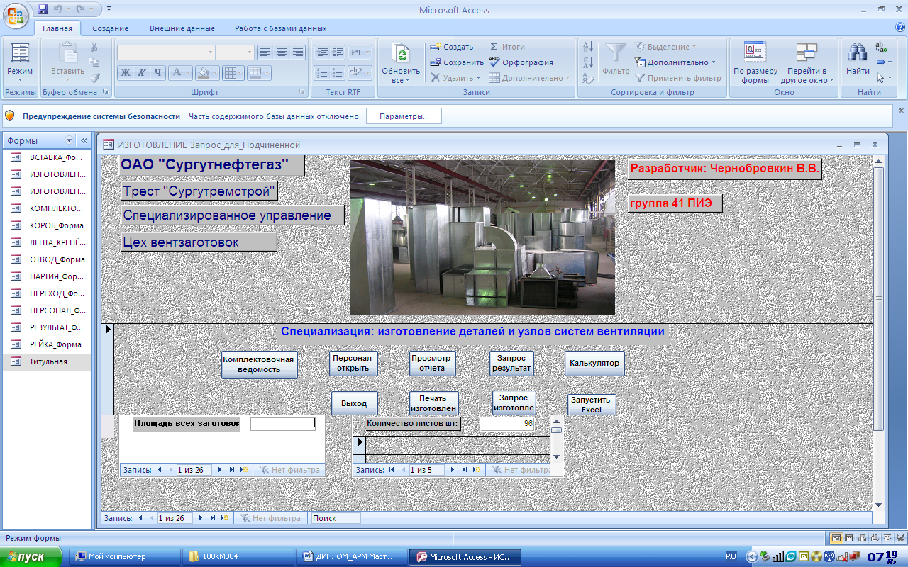 Результатом выполнения дипломного проекта является создание автоматизированного рабочего места мастера СВ и КВ, разработанного с помощью стандартного приложения пакета MS Office – MS Access, позволяющего реализовать поставленные цели.