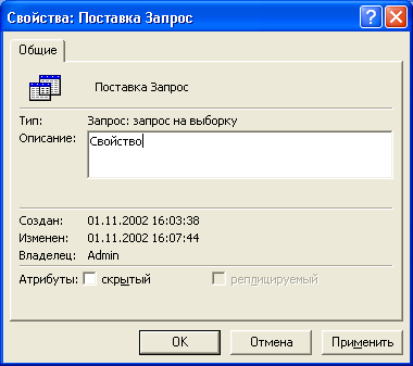 Атрибуты (Attributes): Скрытый (Hidden) — позволяет скрыть таблицу из окна базы данных, Реплицируемый (Replicated) — позволяет управлять реплицируемостью объекта.