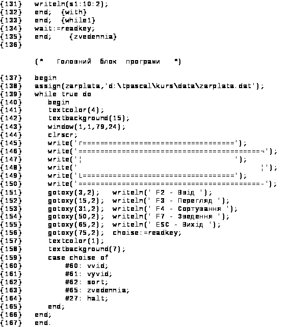 Процедура VYVID. Призначення - читання вхідних даних з дискового файлу ZARPLATA.DAT та вивід їх на дисплей. Процедура викликається з головного меню програми при виборі пункту "Вивід файлу на дисплей" (функціональна клавіша F3). При ініціалізації процедури на екран виводиться екранна форма і відкривається вхідний файл ZARPLATA.DAT для читання. Записи файлу зчитуються з диска один за одним і виводяться на дисплей (див. додаток 5). Процедура завершує роботу при досягненні кінця файлу ZARPLATA.DAT і передає керування в програму.