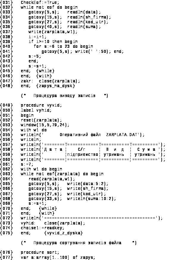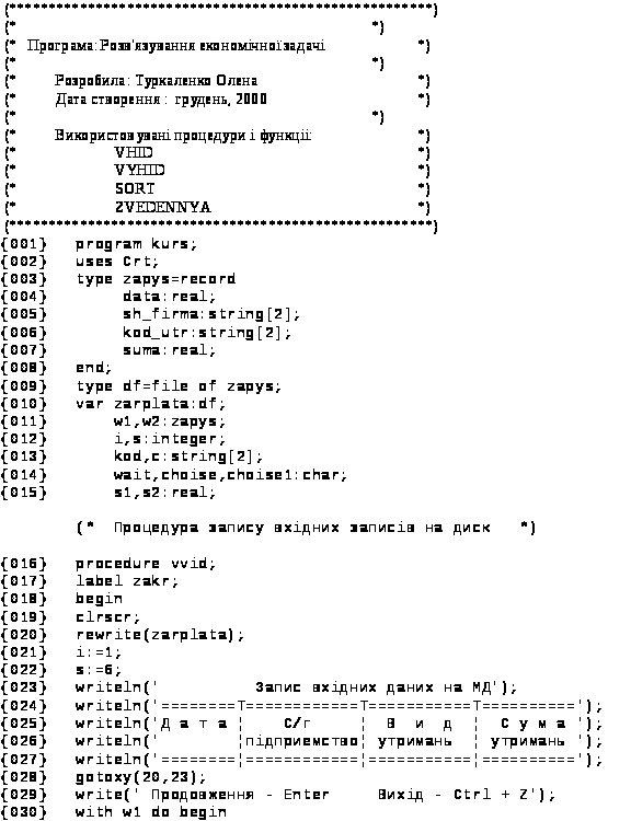 Дана процедура здійснює зчитування записів вхідного файлу та форматований вивід їх на друк з одночасним підрахунком підсумків по коду утримання та по коду с/г підприємства. При досягненні кінця файлу ZARPLATA.DAT процедура завершує свою роботу і передає керування в програму.