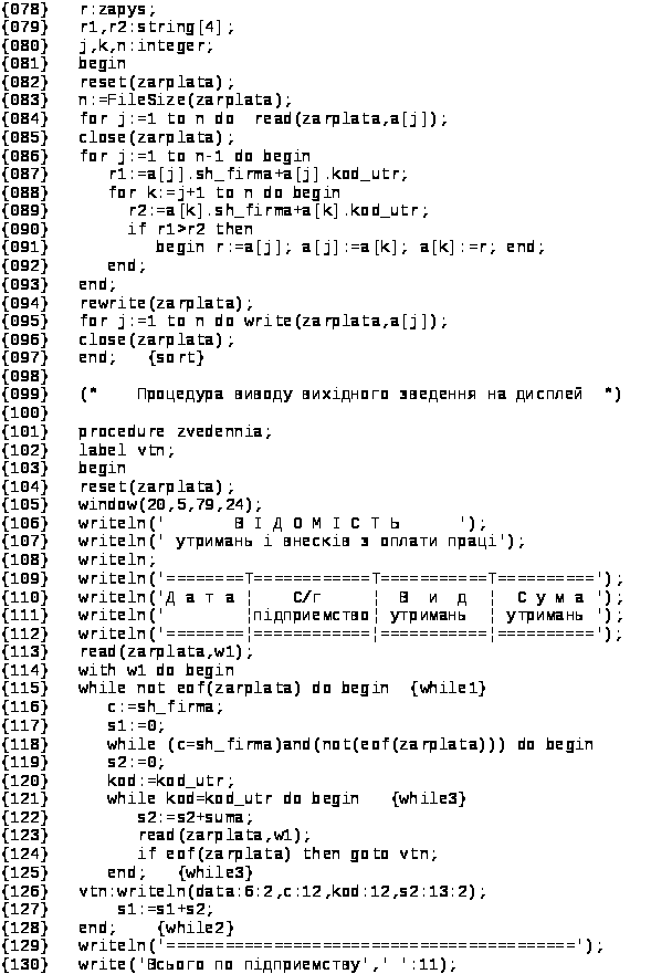 Сортування вхідних даних здійснюється процедурою SORT, формування та вивід зведення на дисплей здійснюється процедурою DRUK_VIDOM.