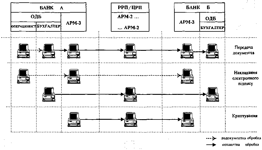 Для надання допомоги банкам - учасникам СЕП у розмежуванні повноважень осіб, які здійснюють підготовку платіжних документів до передачі у СЕП, впроваджено технологію перехресного накладання електронного цифрового підпису на електронні платіжні документи. її суть полягає у тому, що в жодному пункті проходження платіжного документа через СЕП не існує повного набору ключів, який міг би дозволити викривити інформацію. Таким чином забезпечується контроль за достовірністю при проходженні платежів усередині банку та через мережу розрахункових палат НБУ (рис.1).