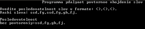 Дана последовательность слов; между соседними словами – запятая, за последним словом – точка. Напечатать эту же последовательность слов, но удалив из неё повторные вхождения слов. Составить блок схему алгоритма и программу.