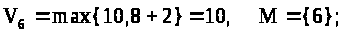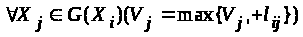 Очевидно, что к каждой вершине могут идти от вершины X >н> несколько путей, суммы длин дуг по разным путям различны. При поиске длиннейшего пути следует выбирать максимальную сумму. Волны распространения веса по разным путям доходят до каждой вершины последовательно, при очередной волне необходимо оставить либо старый вес вершины, либо заменить его на новый (больший). Поэтому при расчете веса вершины X >i> за счет волны, подошедшей к ней по дуге (X >j>, X >i>), производится вычисление веса V >i> по формуле V >i> =max (V >i>, V >j> + l >ji>).