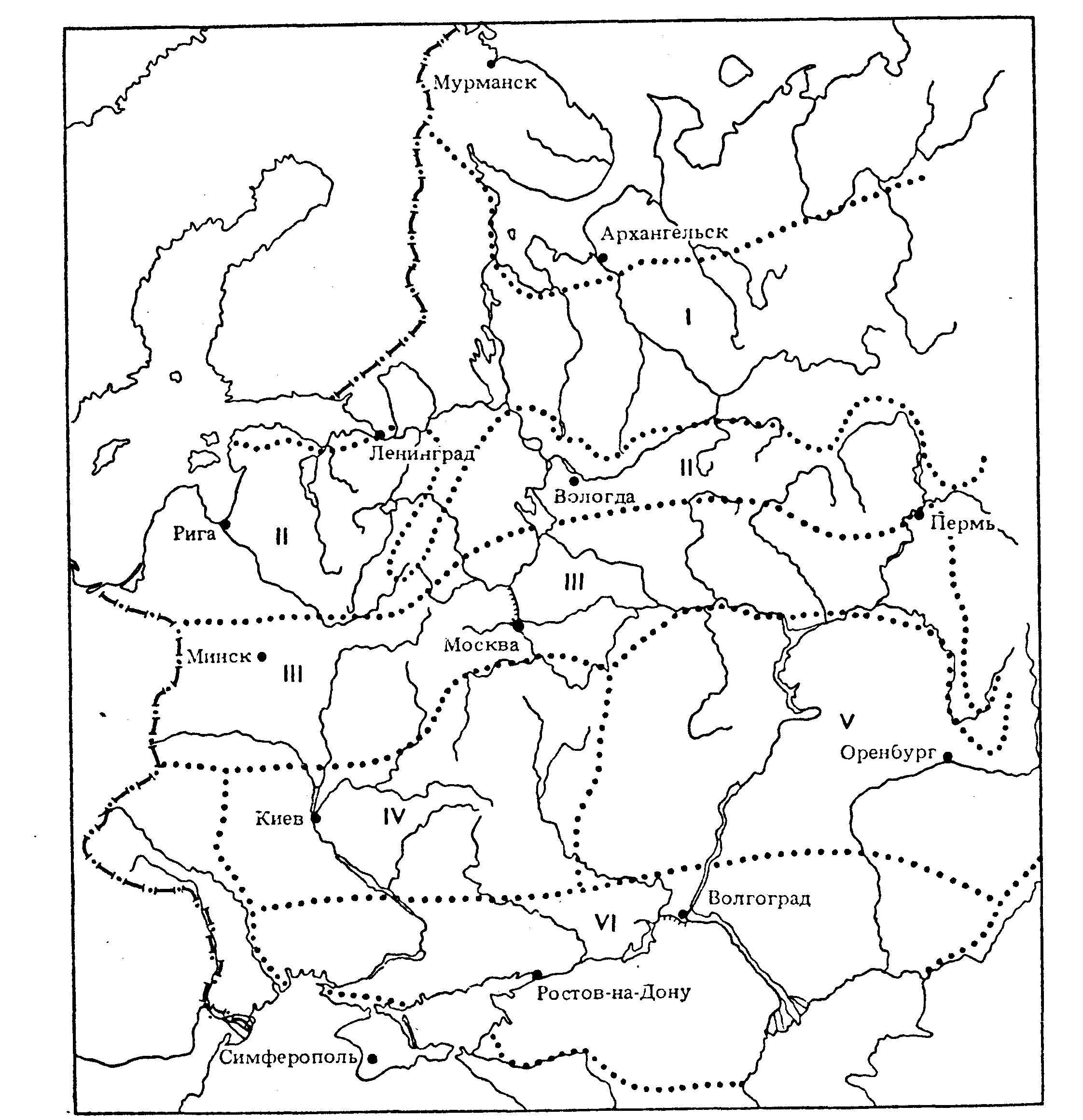 Рис. 3. Районы с одинаковым видом зависимостей для прогнозов объема стока весеннего половодья рек: I, II, III — северная, средняя и южная части лесной зоны; IV и V — западная, центральная и восточная части лесостепной зоны; VI — степная зона.