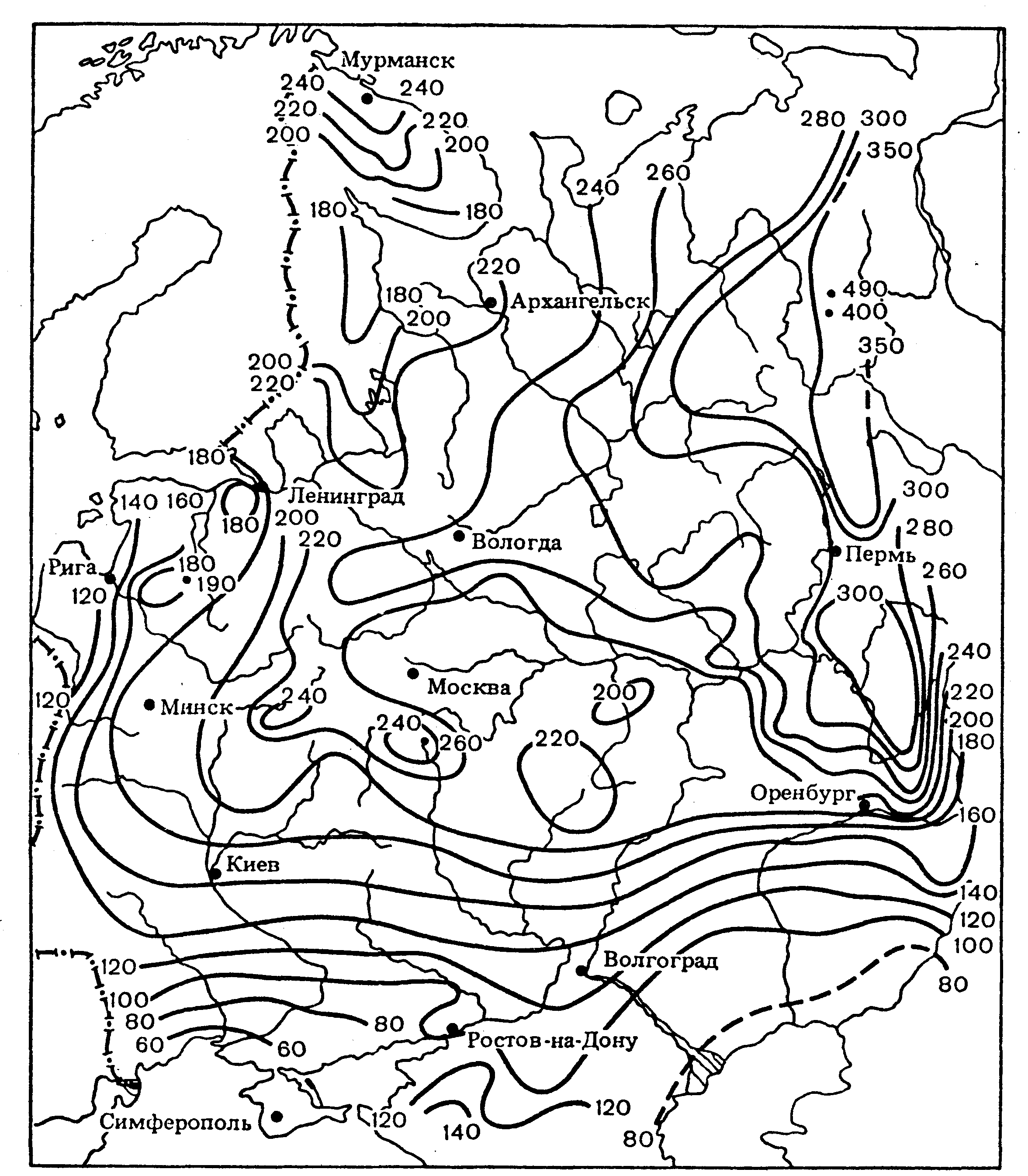 Средняя многолетняя величина максимальных за зиму снегозапасов изменяется от 40—50 мм на юго-западе Украины и в Молдавии до 180—200 мм в Центральной Сибири (рис. 9). Еще более сильно выраженная территориальная изменчивость характерна для наибольших из максимальных снегозапасов: в Европейской части страны они колеблются от 60—80 мм до 300—350 мм (рис. 1).