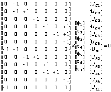 где А – матрица «узел-ветвь»; AT - транспонированная матрица «узел-ветвь»; I – вектор токов ветвей. Строки матрицы соответствуют узлам, а столбцы - ветвям схемы. В столбце i-той ветви записываются единицы на пересечении со строками узлов, при чем +1 соответствует узлу, в который ток i-той ветви втекает, а -1 соответствует узлу, из которого этот ток вытекает. Матрица «узел-ветвь» для схемы с введенными обозначениями узлов, полученной в задаче 6 и показанной на рисунке 10, имеет вид, представленный на рисунке 14 (узел 8 принят в качестве опорного).