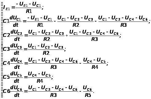 В левых частях уравнений второй системы необходимо заменить I>Cj> на С>j>dU>Cj>/dt, а в правые части вместо I>Ri> подставить величины U>Ri>, выраженные из уравнений первой системы путем деления на R>i>. Окончательная форма ММС по методу переменных состояния имеет вид: