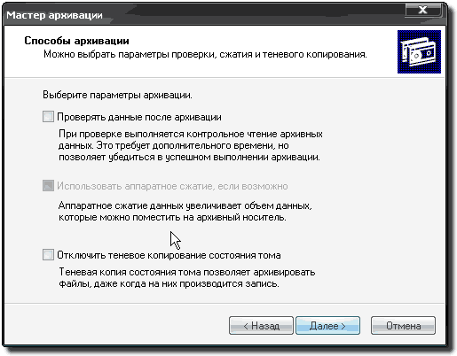 Помимо типа архивации, можно задать и ее способы. Например, произвести проверку данных после копирования.