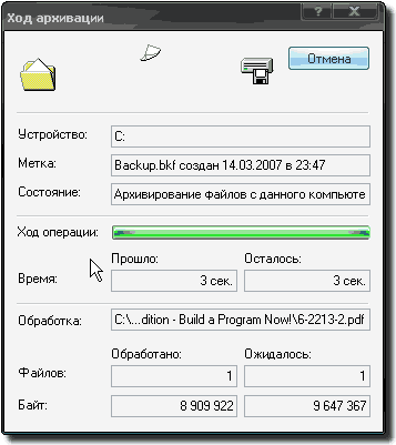 Помимо архивирования собственных данных, «Архивация данных» позволяет собирать информацию для восстановления всей системы в случае ее серьезного сбоя. Этот инструмент называется ASR (Automated System Recovery). При этом архивируется состояние системы, системные службы и все диски, связанные с компонентами операционной системы. В результате работы ASR можно восстановить системный раздел, включая установленное программное обеспечение, системные настройки, документы пользователя и драйвера устройств на момент создания набора ASR. Архив восстановления ASR создается из двух частей – собственно архива с данными и дискеты, содержащей информацию, необходимую для восстановления системы. Для создания архива ASR выберите «Мастер аварийного восстановления системы» на первой закладке или в меню «Сервис». Укажите расположение и имя файла архива. Для завершения вам потребуется одна чистая дискета для записи параметров восстановления.