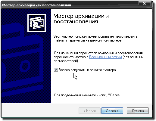 Можно переключится в расширенный режим, щелкнув соответствующую ссылку в окне мастера. Когда вы познакомитесь с работой программы архивации и восстановления, лучше будет убрать флажок «Запускать в режиме мастера», чтобы ускорить установку необходимых параметров и режимов. Пока же позволим мастеру задать нам несколько вопросов. Нажимаем кнопку «Далее», появится диалог с предложением выбрать тип операции, которую мы хотим осуществить.