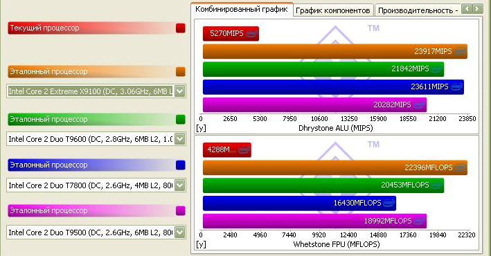 Вторая диаграмма демонстрирует работу АЛУ при выполнении операций с числами с плавающей запятой, здесь текущий процессор тоже значительно отстает от эталонных процессоров – 4288 MFLOPS.