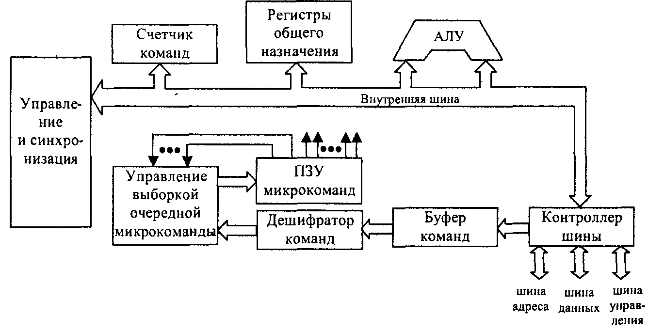 управление выборкой очередной микрокоманды представляет собой небольшой процессор, работающий по принципу фон Неймана, имеет свой счетчик микрокоманд, который автоматически выбирает очередную микрокоманду из ПЗУ микрокоманд;