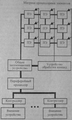 В матричной вычислительной системе процессоры объединяются в матрицу процессорных цементов. В качестве процессорных элементов могут использоваться универсальные процессоры, имеющие собственное устройство управления, или вычислители, содержащие только АЛУ и выполняющие команды внешнего устройства управления. Каждый процессорный элемент снабжен локальной памятью, хранящей обрабатываемые процессором данные, но при необходимости процессорный элемент может производить обмен со своими соседями или с общим запоминающим устройством. В первом случае, программы и данные нескольких задач или независимых частей одной задачи загружаются в локальную память процессоров и выполняются параллельно. Во втором варианте все процессорные элементы одновременно выполняют одну и ту же команду, поступающую от устройства обработки команд на все процессорные элементы, но над разными данными, хранящимися в локальной памяти каждого процессорного элемента. Вариант архитектуры с общим управлением показан на рис. 7. Обмен данными с периферийными устройствами выполняется через периферийный процессор, подключенный к общему запоминающему устройству.