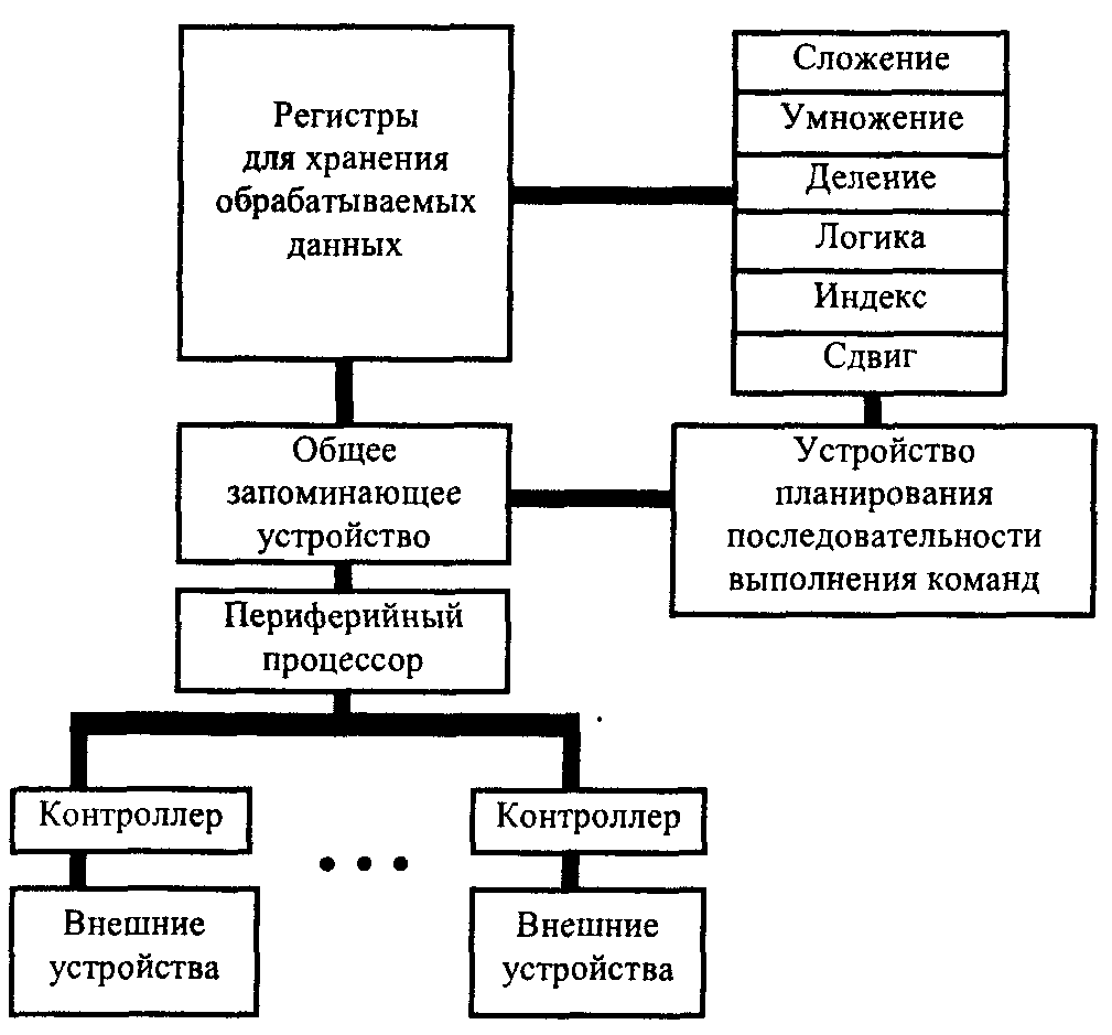 Периферийный процессор осуществляет обслуживание внешних устройств при вводе и выводе информации из обшей памяти. Он может быть того же типа, что и остальные процессоры, но обычно устанавливается специализированный процессор, предназначенный для выполнении операций управления внешними устройствами.