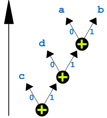 Суть цієї деревовидної структури в тому, щоб кожному з символів спів ставити різне число біт в залежності від його частоти (як вже казалося, в нетиснутому файлі символи зберігаються в виді груп по вісім біт). Якщо уважно придивитись в цей малюнок, ви побачите, що кожна з гілок відмічена або нулем або одиницею. Таким чином, якщо уявно пройтись по дереву від кореня до якої-небудь вершини, маючої символ, то послідовність нулів та одиниць, які зустрічаються на вашому шляху, буде комбінацією біт для цього символу. Наприклад, символ "с" як найбільш часто зустрічаємий буде кодуватися одним бітом "0", символ "d" двома бітами "10" і т.д. (див. Малюнок №2)