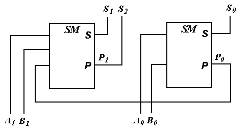 Усі розряди доданків повинні одночасно надходити до пристрою додавання. Сигнал переносу передається від розряду до розряду послідовно, утворюючи на виході значення старшого розряду суми. Схема паралельного дворозрядного комбінаційного суматора з послідовним переносом показана на рис. 1.