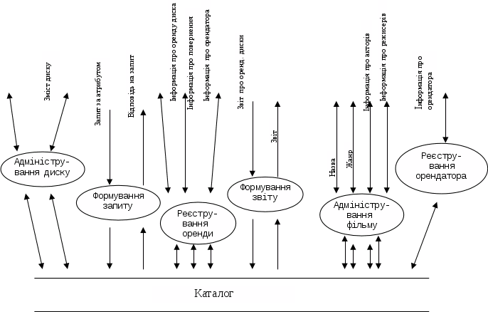 На підставі обстеження функціонування фільмотеки проведемо аналіз за методологією нотації Йордана у вигляді ієрархій діаграм. Представимо всю інформацію у графічному виді за допомогою діаграм DFD. Спочатку розробимо діаграму 0 рівня (рис. 1). Тут представлено взаємодію зовнішніх сутностей для вирішення поставленої задачі..