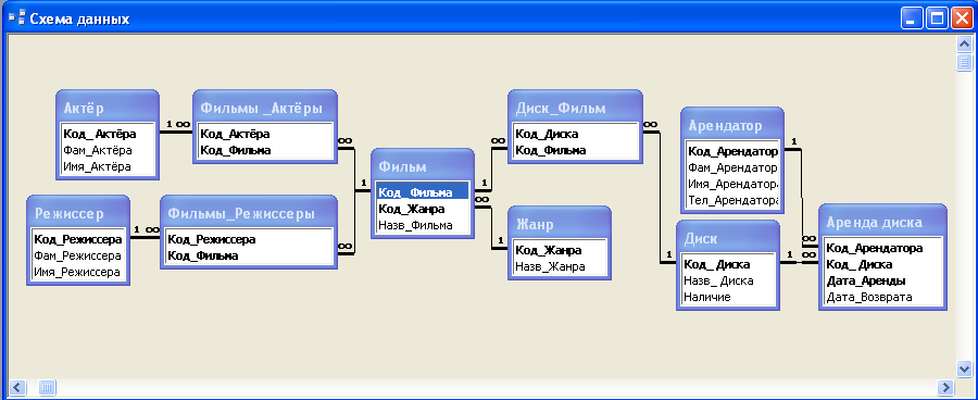 FROM (Жанр INNER JOIN Фильм ON Жанр.Код_Жанра=Фильм.Код_Жанра) INNER JOIN (Диск INNER JOIN Диск_Фильм ON Диск.[Код_ Диска]=Диск_Фильм.Код_Диска) ON Фильм.[Код_ Фильма]=Диск_Фильм.Код_Фильма