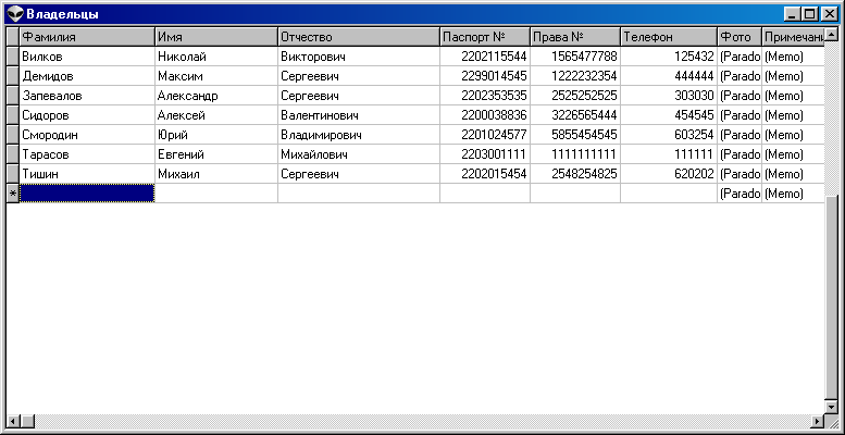 Все таблицы, запросы находятся в DateModule. Для получения доступа к любой таблице или запросу в этом модуле необходимо просто обратится к нему, а потом и к выбранному элементу. Каждой таблице, приведенной выше, соответствует форма для ввода данных в эту таблицу: Cars.db – CarsForm, Owners.db – OwnersForm, AOrders.db – FormAOrders и т.д. Ввод информации о владельцах, об автомобилях, оформление заказов осуществляется с соответствующих форм, содержащих стандартные элементы управления, связанные с данными в таблице.
