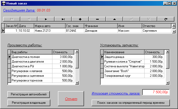 Данная база данных предназначена для организаций, занимающихся любыми видами услуг по техническому обслуживанию автомобилей (Автосервис). БД позволяет вести учет всех автомобилей, когда-либо находящихся в автосервисе, хранит полную информацию о каждом автомобиле (марка, регистрационный знак, цвет, год выпуска, серийные номера завода-изготовителя и т.п.), позволяет вести учет владельцев автомобилей, которые когда-либо обращались в автосервис. Программа позволяет также распечатать отчет по всем параметрам, интересующим как владельцев автосервиса (информация о владельцах автомобилей, информация об автомобилях, полный отчет по всем заказам либо по заказам за определенный интервал времени), так и его клиентов (расценки на услуги, новые запчасти, сезонные скидки); это позволяет вести отчетность на бумаге.