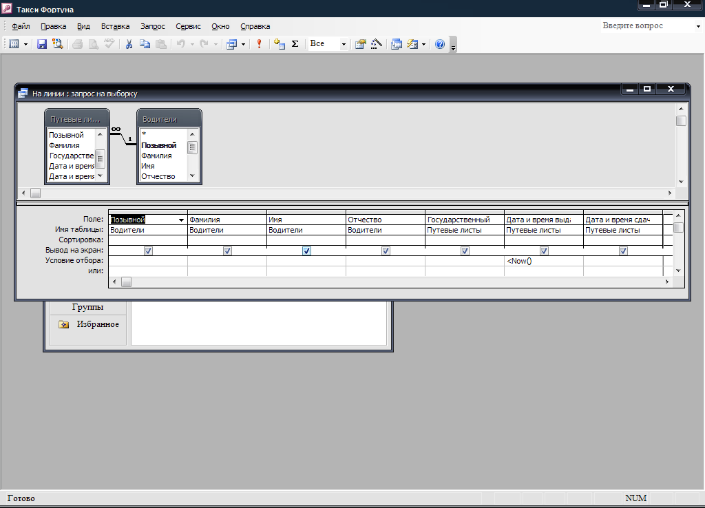 Далее сделаем несколько запросов на выборку по различным параметрам, а также отчеты к ним. Например, сделаем запрос, выдающий сведения о водителя и автомобилях, находящихся на линии; запрос, вычисляющий время работы по путевому листу, а также его стоимость и др.