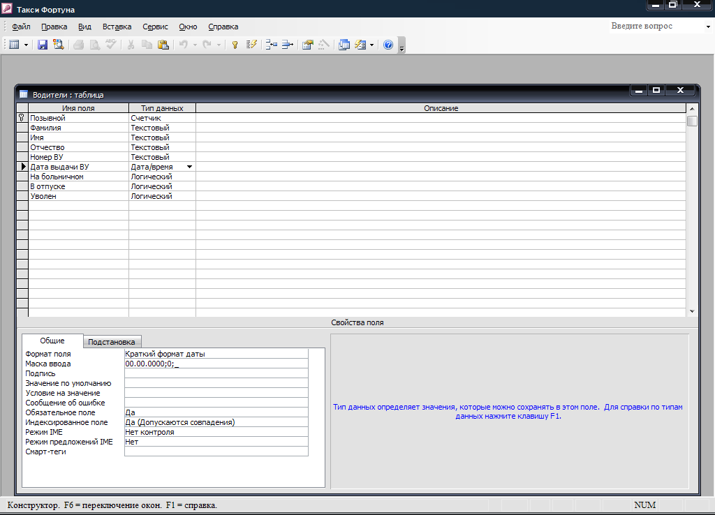 Создаем таблицу «Водители». Для создания таблицы используем конструктор, как более подробный метод (рисунок 1). В таблице зададим следующие поля: «Позывной», «Фамилия», «Имя», «Отчество», «Номер ВУ», «Дата выдачи ВУ», «На больничном», «В отпуске», «Уволен». Поле «Позывной» имеет формат счетчика. Следующие поля – текстовые, «Дата выдачи ВУ» имеет формат даты/времени, а последние три поля – логические.