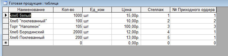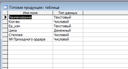 Запрос «Готовая_продукция» используется для формирования отчета «Готовая продукция», отбирает данные о продукции. используются поля Наименование, Кол-во, Ед_изм, Цена, № Приходного ордера, Стеллаж из таблицы «Готовая продукция».