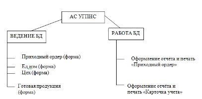 Функциональная схема состоит из двух частей: Ведение БД и Работа с БД. Ведение БД заключается в возможности просмотра и редактирования данных. Работа с БД подразумевает под собой возможность просмотра отчётов, а также выполнение запросов.
