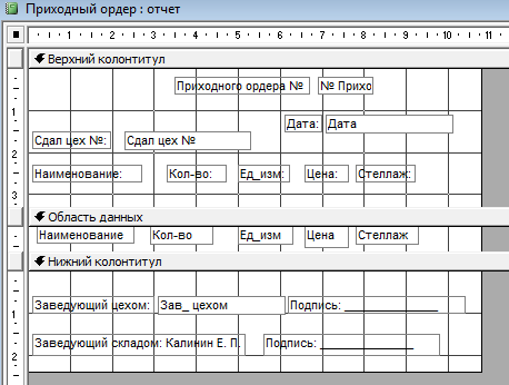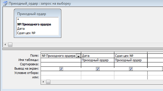 Запрос «Приходный_ордер» используется для формирования отчетов «Приходный ордер» и «Карточка учета» , отбирает данные об отдельно взятой накладной. Используются поля №Накладной (поиск по № накладной), дата, Сдал цех №, Принял склад из таблицы «Приходный ордер», поле Зав. складом из таблицы «Склад».