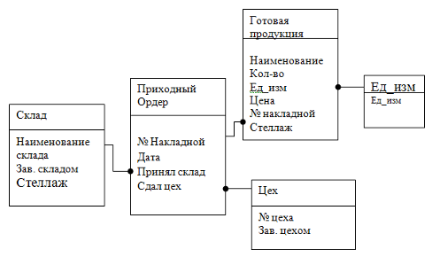 Так как таблица «Готовая продукция» содержит атрибут «ед_изм.», который может повторяться, то этот атрибут необходимо вынести в отдельную таблицу «Ед_изм». И связать эти таблицы связью один ко многим.