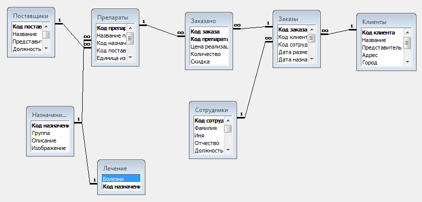 В базе данных аптеки на каждую группу препаратов (антибиотики, антисептики и т.п.) приходится небольшое количество лекарственных средств, которые находятся на складе аптеки.