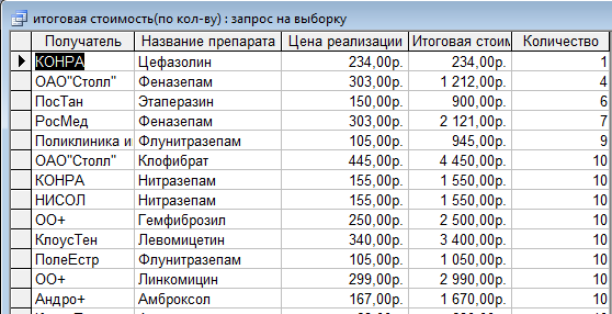 Итоговая стоимость по количеству. Данный запрос позволяет увидеть итоговую цену каждого препарата, заказанного определенным клиентом. Например, клиент "ПосТан" заказал этаперазин в количестве 6 штук. Обычная цена препарата - 150 руб. В итоге - 900 руб.