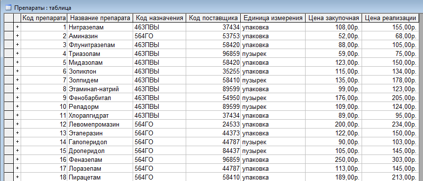Рис.2. Таблица "Препараты"